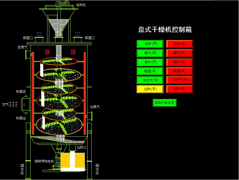 濕物料自加料器連續(xù)地加到干燥器上部第一層干燥盤上,帶有耙葉的耙臂作回轉(zhuǎn)運(yùn)動(dòng)使耙臂作回轉(zhuǎn)運(yùn)動(dòng)使耙葉連續(xù)地翻抄物料。物料沿指數(shù)螺旋線流過干燥盤表面,在小干燥盤上的物料被移送到外緣,并在外緣落到下方的大干燥盤外緣,在大干盤上物料向里移動(dòng)并從中間落料口落如下一層小干燥盤中。大小干燥盤上下交替排列,物料得以連續(xù)地流過整個(gè)干燥器。中空的干燥盤內(nèi)通入加熱介質(zhì),加熱介質(zhì)形式有飽和蒸汽、熱水和導(dǎo)熱油,加熱介質(zhì)由干燥盤的一端進(jìn)入,從另一端導(dǎo)出。已干物料從^后一層干燥盤落到殼體的底層,^后被耙葉移送到出料口排出。濕份從物料中逸出,由設(shè)在頂蓋上的排濕口排出,真空型盤式干燥器的濕氣由設(shè)在頂蓋上的真空泵口排出。從底層排出的干物料可直接包裝。通過配加翅片加熱器、溶劑回收冷凝器、袋式除塵器、干料返混機(jī)構(gòu)、引風(fēng)機(jī)等輔機(jī),可提高其干燥的生產(chǎn)能力,干燥膏糊狀和熱敏性物 料,可方便地回收溶劑,并能進(jìn)行熱解和反應(yīng)操作。