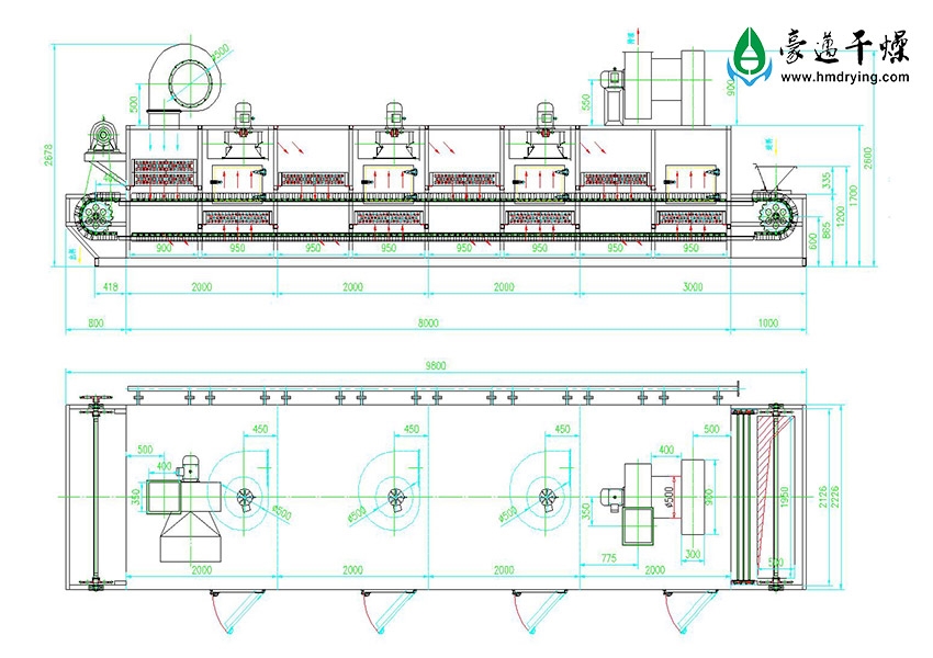 (1) 被干燥物料由進(jìn)料端經(jīng)加料裝置被均勻分布到輸帶上,由電機(jī)經(jīng)變速箱帶動(dòng),可以調(diào)速。