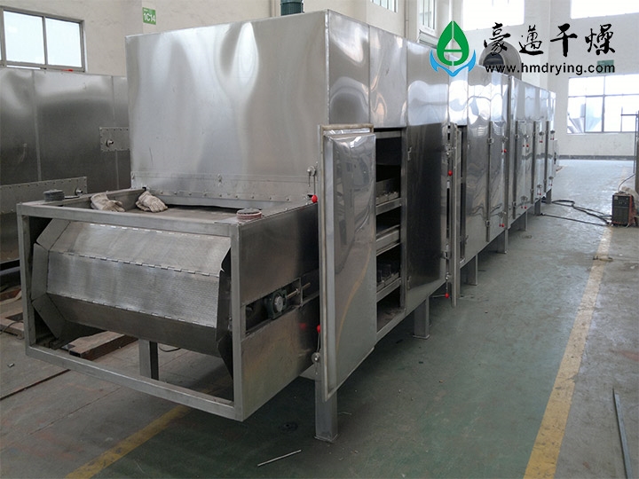 目前小塊的物料及纖維質(zhì)物料的干燥使用較多的設(shè)備有箱式干燥機(jī)、隧道式干燥機(jī)和網(wǎng)帶式干燥機(jī)三大類。前兩種為間歇式生產(chǎn),勞動(dòng)強(qiáng)度大、自動(dòng)化程度低、不可控因素多;網(wǎng)帶式干燥機(jī)實(shí)現(xiàn)了物料進(jìn)出的連續(xù)性和自動(dòng)化,生產(chǎn)效率高,符合現(xiàn)代化大生產(chǎn)的發(fā)展需求,因此被廣泛應(yīng)用。
