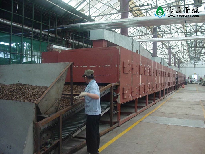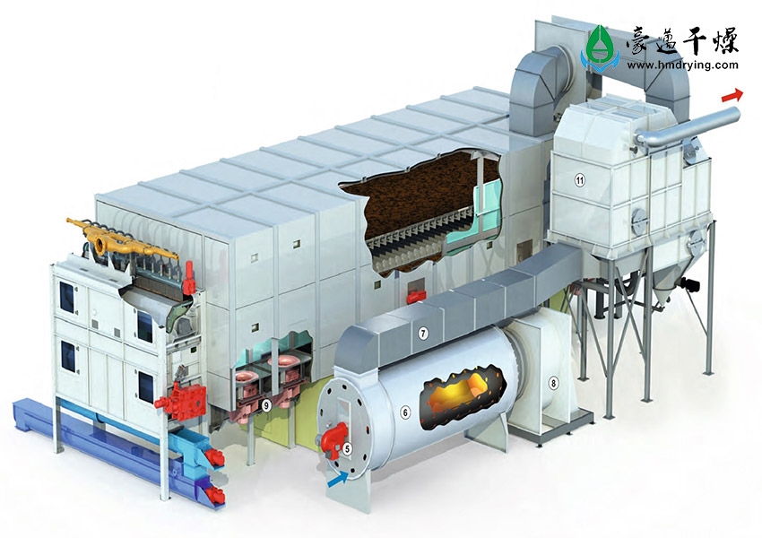 將要干燥的物料通過合適的加料裝置均勻的分布在可調(diào)速運(yùn)行的網(wǎng)帶上,干燥時(shí)熱空氣分別由網(wǎng)帶和物料的空隙間上下方穿流通過,使被干燥物料的每個(gè)表面都成為受熱面,顯著增加了物料與熱風(fēng)的換熱接觸面積,使物料內(nèi)部水分的蒸發(fā)擴(kuò)散距離縮短,因此,能夠進(jìn)行效果極好的干燥操作。熱空氣單元獨(dú)立橫向循環(huán)的方式使得熱風(fēng)的穿透性更強(qiáng),溫度及風(fēng)量的控制更加靈活方便,從而相對(duì)與不同種類,性質(zhì)的物料具有更廣泛的適應(yīng)性。