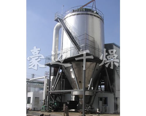 空氣經(jīng)過(guò)濾和加熱,進(jìn)入干燥器頂部空氣分配器,熱空氣呈螺旋狀均勻地進(jìn)入干燥室。料液經(jīng)塔體頂部的高速離心霧化器,(旋轉(zhuǎn))噴霧成極細(xì)微的霧狀液珠,與熱空氣并流接觸在極短的時(shí)間內(nèi)可干燥為成品。成品連續(xù)地由干燥塔底部和旋風(fēng)分離器中輸出,廢氣由風(fēng)機(jī)排空。
