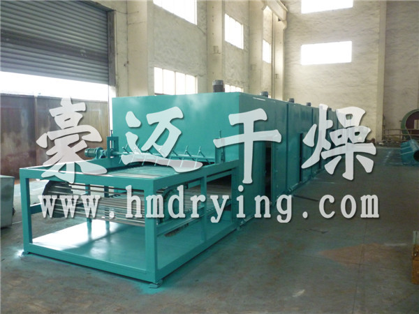 物料由加料器均勻地鋪在網(wǎng)帶上,網(wǎng)帶一般采用12-60目不銹鋼絲網(wǎng),由傳動裝置拖動在干燥機(jī)內(nèi)移動。干燥機(jī)由若干單元組成,每一單元熱風(fēng)獨立循環(huán),部分尾氣由專門排濕風(fēng)機(jī)排出,廢氣由調(diào)節(jié)閥控制,熱氣由下往上或由上往下穿過鋪滿物料的網(wǎng)帶完成熱量與質(zhì)量傳遞的進(jìn)程,帶走物料水份。網(wǎng)帶緩慢移動,運行速度可根據(jù)物料溫度自由調(diào)節(jié),干燥后的成品連續(xù)落入收料器中。上下循環(huán)單元根據(jù)用戶需要可靈活配備,單元數(shù)量亦可根據(jù)需要選取。