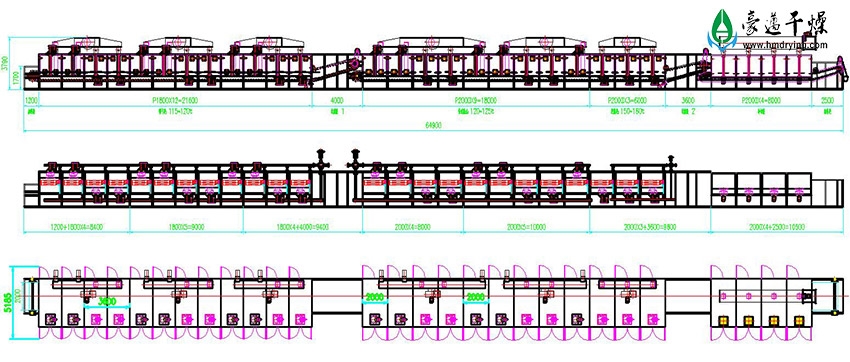 (2) 強制循環(huán)網(wǎng)帶式干燥機的機箱內(nèi)設有水平的輸送帶,網(wǎng)帶傳動裝置設為變頻調(diào)速裝置,控制被傳送設備的運行速度的快慢且運行速度平穩(wěn)。濕物料經(jīng)傳送設備從進料口進入機箱,由布料器均勻鋪在輸送帶上,經(jīng)過輸送帶傳輸物料由第一臺帶機輸送帶掉落在第二臺輸送帶上,每層輸送帶分別由一變頻調(diào)速的傳動電機帶動,可根據(jù)每次輸送物料的質(zhì)量獨立控制調(diào)節(jié)每層輸送帶運行的速度快慢,以達到物料充分干燥的效果。