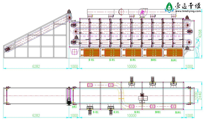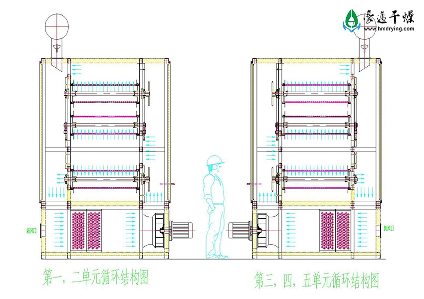 設(shè)備每個(gè)循環(huán)單元均有隔艙板隔開獨(dú)立循環(huán),隔艙板采用SUS304/δ1.2~1.5制作,使得帶機(jī)在工作狀態(tài)中每個(gè)單元間無竄風(fēng)現(xiàn)象,提高干燥效率。設(shè)備每個(gè)循環(huán)單元均設(shè)有濕度儀及電動(dòng)風(fēng)門執(zhí)行器實(shí)現(xiàn)自動(dòng)排濕,節(jié)約能源。網(wǎng)帶的兩側(cè)采用迷宮密封的方式,隔斷側(cè)風(fēng)通路,也就可阻止物料從側(cè)面跑料。所有新風(fēng)補(bǔ)充口均裝有中效過濾器,保證進(jìn)風(fēng)潔凈度。采用獨(dú)特的內(nèi)部送風(fēng)、均風(fēng)裝置,不但提高了物料與熱空氣之間的相對速度,提高干燥速率,并能使得物料干燥均勻一致。