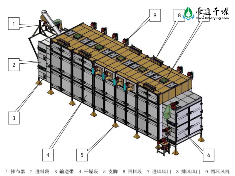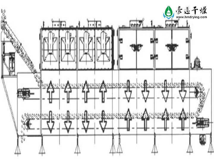 具體原理:空氣在經(jīng)過干燥機(jī)內(nèi)部的熱交換器加熱后,在循環(huán)風(fēng)機(jī)的推動(dòng)下進(jìn)入干燥機(jī)。在輸送帶上干燥介質(zhì)與物料進(jìn)行熱量與水份的交換后,一部分空氣通過公共風(fēng)管排出,另一部分空氣經(jīng)過熱交換器的二次加熱,同時(shí)混合新鮮空氣再次進(jìn)入干燥機(jī)。