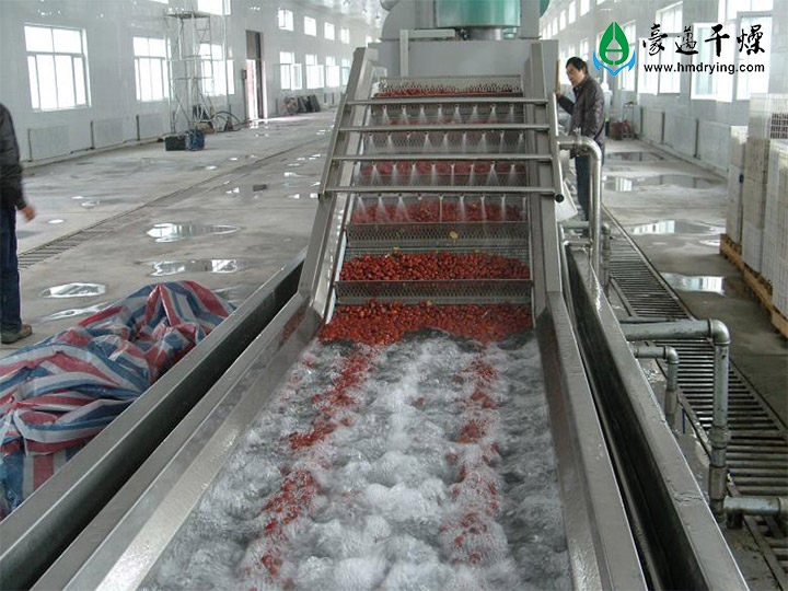 新鮮水果蔬菜因種類繁多,在干燥時(shí)物料具有不同的特性工藝要求,因此在選型時(shí)因根據(jù)物料性質(zhì)合理調(diào)整設(shè)備結(jié)構(gòu)、配置、干燥方法,以適應(yīng)物料性質(zhì)及用戶要求。針對(duì)多品種蔬菜干燥的要求,采用臺(tái)脫水蔬菜干燥機(jī)串聯(lián)使用的方法,使之組成一條干燥生產(chǎn)線,形成初、中、終三個(gè)干燥階段,每階段采用不同的網(wǎng)帶走速,各干燥單元溫度均可調(diào)整,以適應(yīng)多品種物料在不同干燥階段的物性,組合成一個(gè)合理的干燥工藝過(guò)程,獲得優(yōu)質(zhì)的產(chǎn)品質(zhì)量,有效節(jié)省能源。