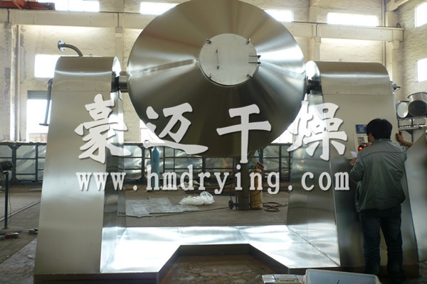 雙錐回轉真空干燥機為雙錐形的回轉罐體,罐內(nèi)在真空狀態(tài)下,向夾套內(nèi)通入蒸汽或熱水進行加熱,熱量通過罐體內(nèi)壁與濕物料接觸,濕物料吸熱后蒸發(fā)的水汽,通過真空泵經(jīng)真空排氣管被抽走。由于罐體內(nèi)處于真空狀態(tài),且罐體的回轉使物料不斷的上下內(nèi)外翻動,故加快了物料的干燥速度,提高干燥效率,達到均勻干燥的目的。