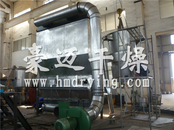 潔凈的熱風經(jīng)閥板分配進入床體內,從加料器進入的濕物料被熱風形成沸騰狀態(tài)。粉粒狀物料由加料器定量連續(xù)加入干燥機的第一室,由于物料處于流化狀態(tài),所以可以自由的從第一室移入相鄰后面的室,干燥后的產品從^后一個室的卸料口排出。由于熱風與物料廣泛接觸,增強了傳熱傳質的過程,因此在較短時間內就可干燥。如用連續(xù)型,物料從床體的一頭進入,經(jīng)過幾十秒至幾分鐘沸騰干燥,自動從床體另一頭流出。本設備一般進行負壓操作。