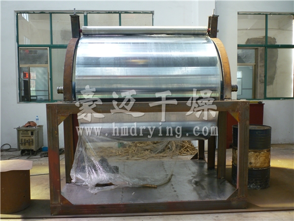滾筒刮板干燥機(jī)是附在回轉(zhuǎn)的滾筒筒體上液相物料以熱傳導(dǎo)的方式進(jìn)行連續(xù)操作的干燥設(shè)備。料液同布料裝置在一定的轉(zhuǎn)速回轉(zhuǎn)的滾筒外壁上形成料膜,被連續(xù)通入的加熱介質(zhì)(水蒸汽或?qū)嵊停┑臒釢L筒壁所加熱,料膜被干燥后由刮刀刮下。