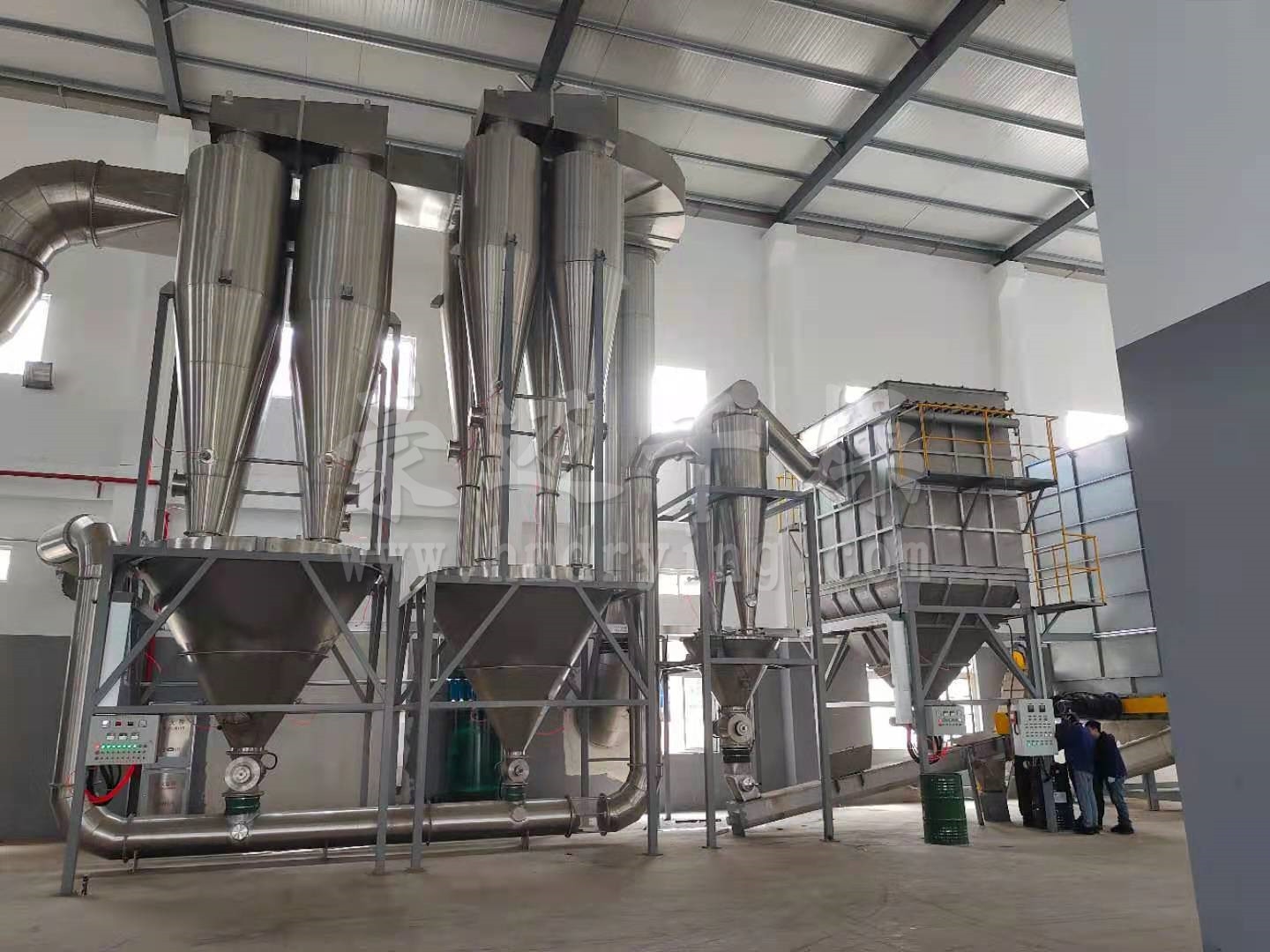 將壓榨后的物料(含水55%)通過(guò)螺旋送入一級(jí)干燥機(jī),將水粉烘干至含水量43%左右再將物料送入二級(jí)槳葉干燥機(jī)進(jìn)行再次干燥,干燥至含水25%左右,將干燥后的顆粒和粉料進(jìn)行篩分,去除大顆粒雜質(zhì),將篩分后的物料送入三級(jí)旋磨閃蒸干燥機(jī)進(jìn)行粉碎烘干,得含水7%左右的產(chǎn)品,后將產(chǎn)品進(jìn)行集中風(fēng)送冷卻。